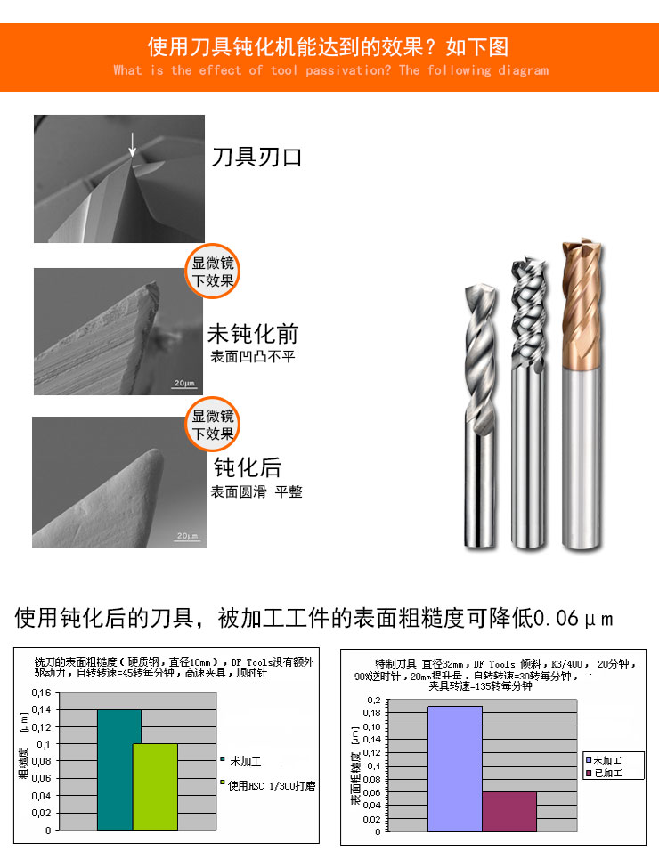 2.刃口經鈍化處理后會變得很光滑,極大減少崩刃,工件表面光潔度也會提高。